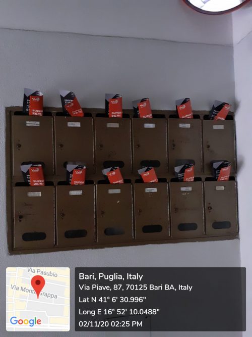 RICHIEDI UN PREVENTIVO GRATUITO CHIAMA ORA 320 23.88.414Ci è stato commissionato il servizio di volantinaggio a Bari per Creative Lab, con modalità di distribuzione nelle sole buche postali, divisi in tre zone distinte.